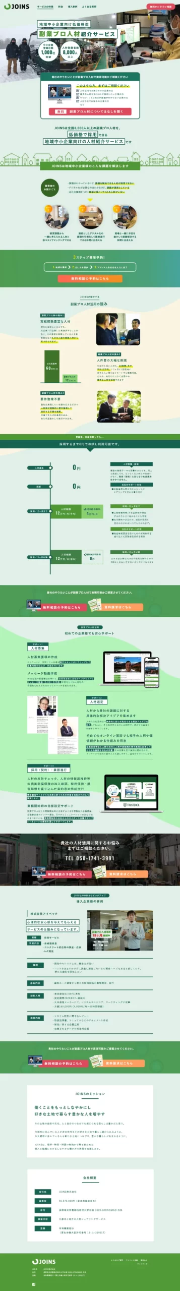 JOINS様の理念や取り組みに大変興味を持っており、このたび集客のお手伝いができたことを心から嬉しく思っております。今回作成したLPは、地方企業の代表者様が都心で活躍するプロフェッショナル人材に向けてお仕事を掲載し、集客を図るためのものでした。