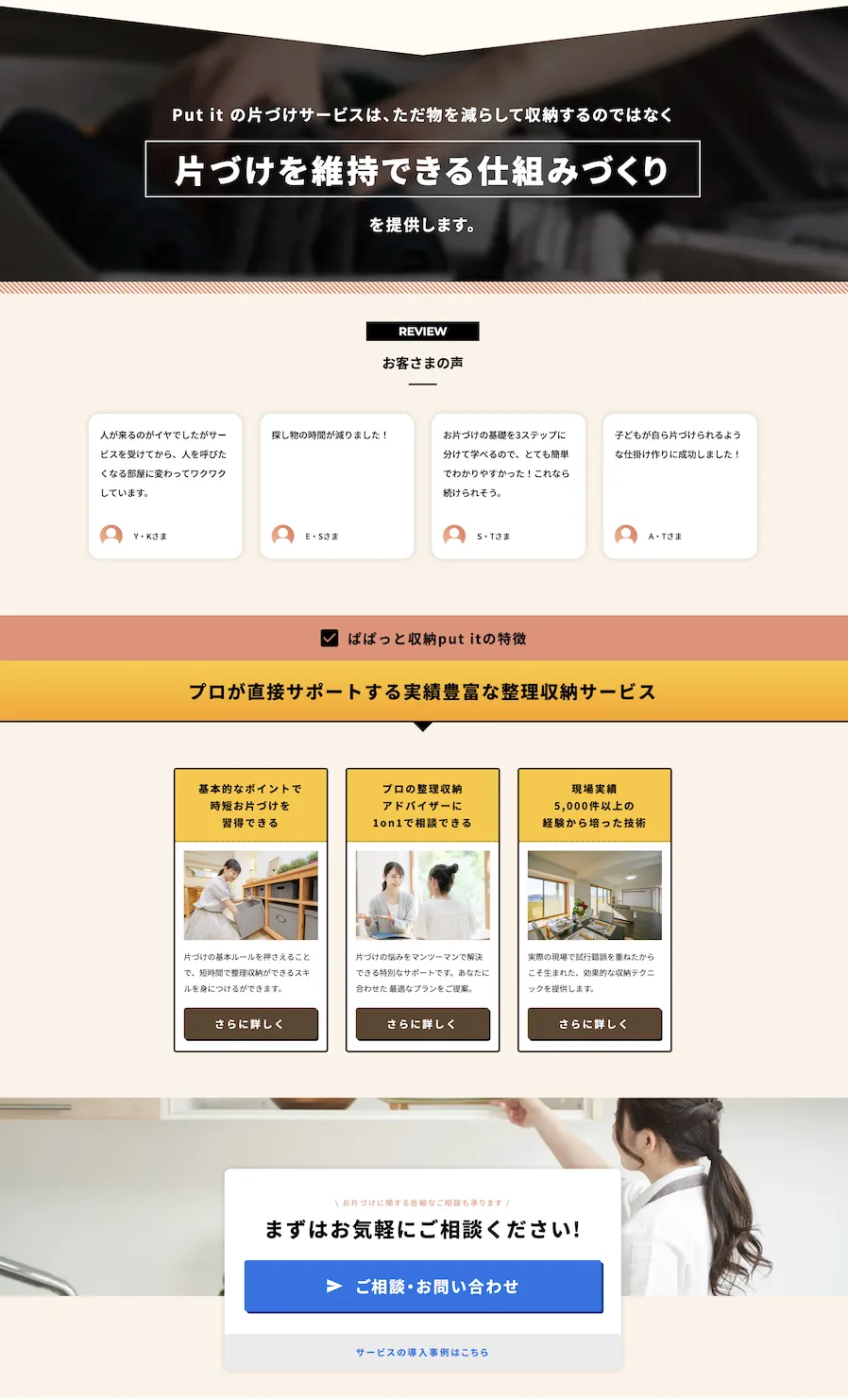 名古屋を中心に整理収納やホームステージングサービスを提供する「ぱぱっと収納 Put it」様のホームページを制作しました。こちらのサービスは整理収納を目的としたBtoCサービスから、工務店や不動産会社様に向けたホームステージングや展示会イベントの企画運営までを行うBtoBサービスがあります。どのサービスも一元化できることから唯一のオールインワンサービスを提供できる素敵な事業者様です。